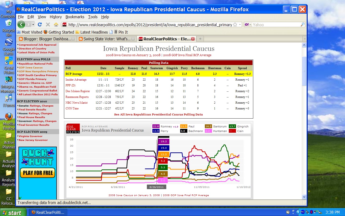 As you can see, Romney is currently eking out an extremely narrow lead over Ron Paul, and Rick Santorum is in the midst of a surprising last-minute surge that has him at third and rising. Poor Newt, who only a few weeks again was strongly leading, is now fourth.