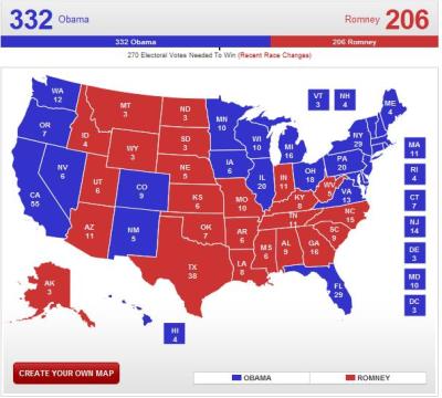 While I wouldn’t totally discount the 332 electoral vote scenario, it is of course likely to come down. But on this front, Obama is still on very solid ground. Of the states he carried in 2008, Indiana has switched back, and North Carolina looks like it has too. But he’s in the lead in all the other swing states, and even if you just restrict the map to states where he has a lead of 3% or more, it looks like this: