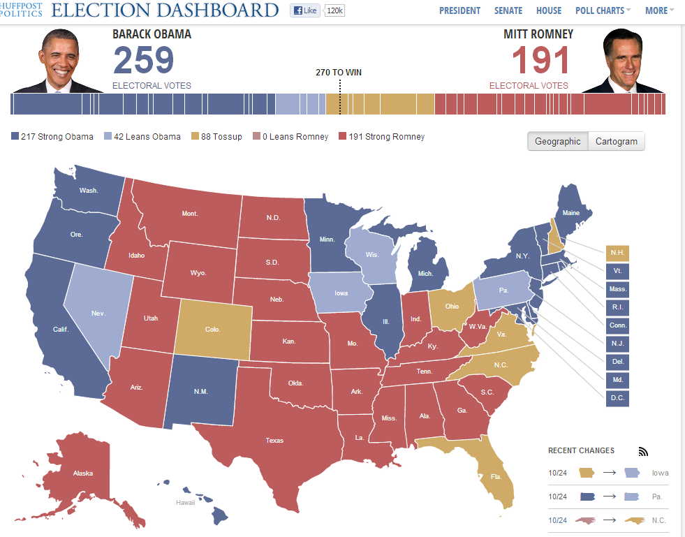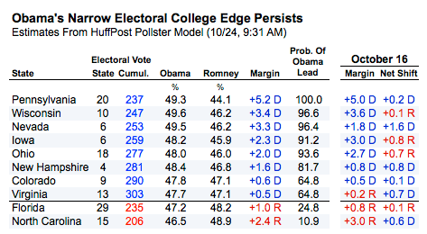 And 270, of course, wins it, even if nationally you’re behind by 1 percent. And if Iowa, Colorado and Virginia squeak past the line for Obama too, it could even get up to 303.