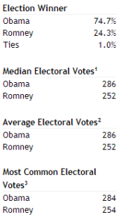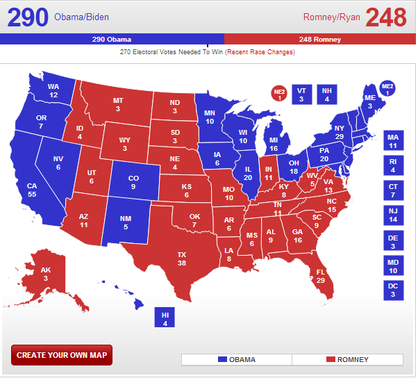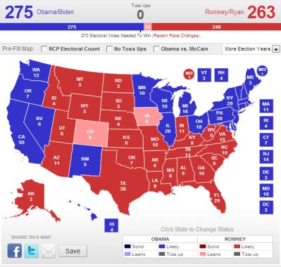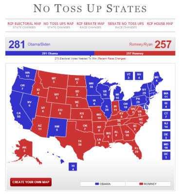 2. As David Rothschild helpfully reminded all us poll junkies today, the popular vote doesn’t actually matter. The electoral vote determines who is elected President. RCP, the aggregator of the three featured here that currently has the widest Romney margin, has a no toss-up electoral map that looks like this:
