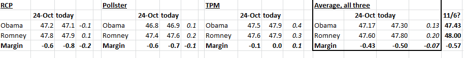 If you average the three (which are themselves averaging multiple polls, and adjusting their mix in various ways), it would seem that both candidates have, at best, a smidgen of momentum, and Romney’s is a bit larger. If you rolled the change over the last week forward another week, we’d be at Romney 48, Obama 47.4. Then it would all be about how the remaining undecideds split. Even if they split disproportionately toward Romney (and there’s good historical perspective and recent analysis that casts doubt on that), we’d probably still be looking at something that’s within one percent.