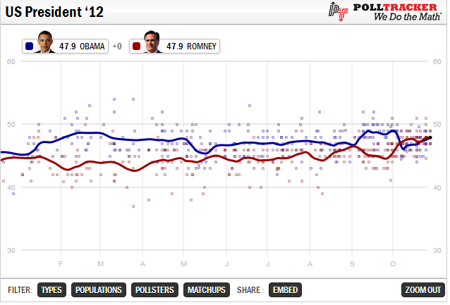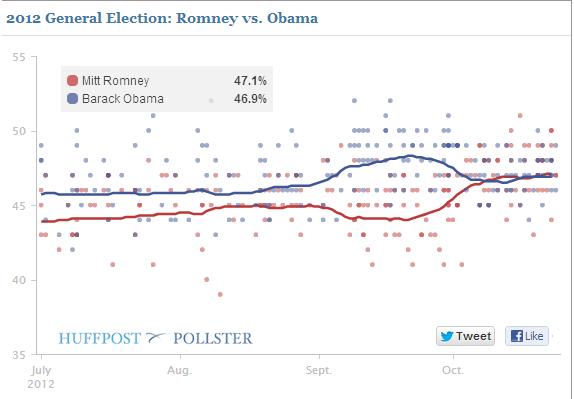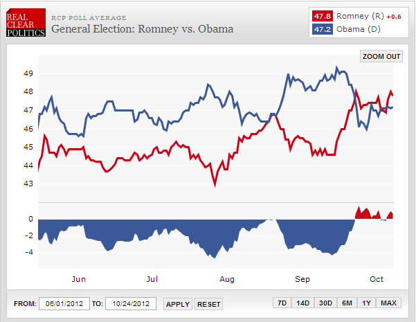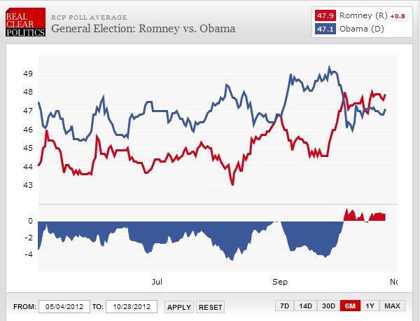 1. RealClearPolitics, as you’ve seen above, currently has Romney in the lead by 0.8%. But the 8 polls that average is made up of currently have an average margin of error of 3.13%. Even if you assume that pooling them together cuts the collective margin of error, say, in half, it would still be around 1.5%. So Romney and Obama’s separation is well within that margin of error. I.e. the margin we’re seeing could just as easily be the product of statistical noise.