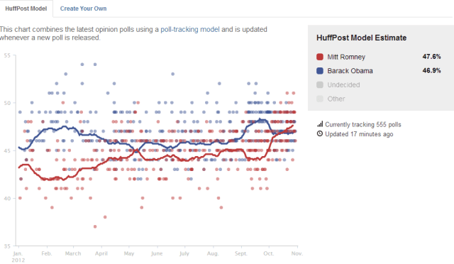 Similarly, HuffPost Pollster’s numbers have Romney ahead by 0.7%, but their estimate of their model’s margin of error is around 1.2%. Once again, Obama could just as easily be ahead. Or Romney could be further ahead than he seems. Or they could be nearly exactly tied. The point is, the numbers are so close together that they aren’t really useful in distinguishing which of these it is.