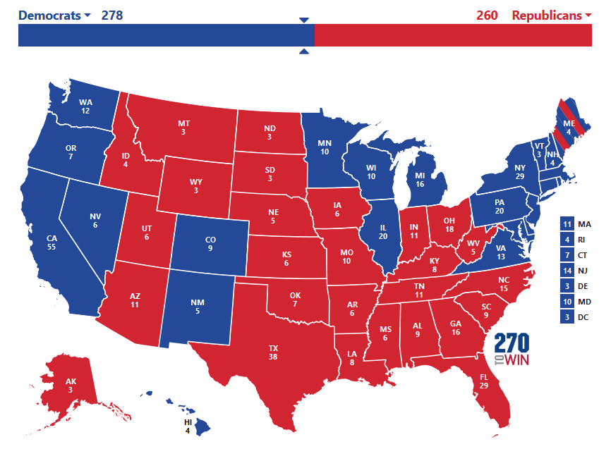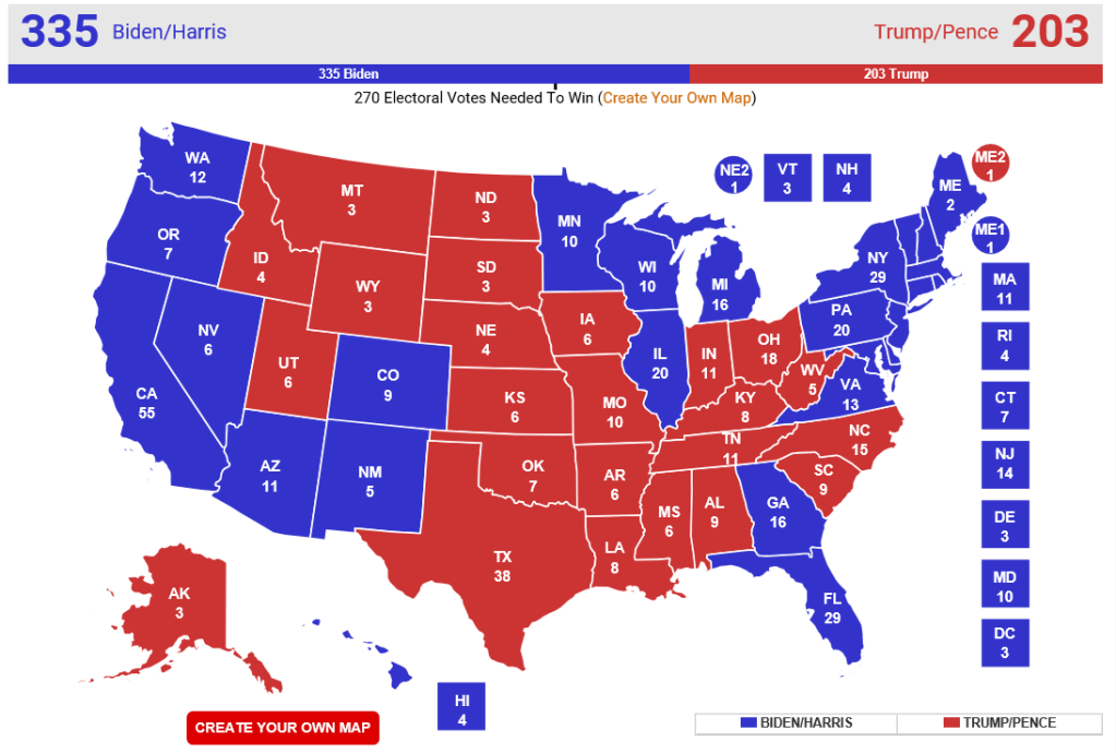 If one just takes the three states 538 has Biden ahead by more than a typical 3% margin of error and leaves everything else to Trump, this is the resulting map: