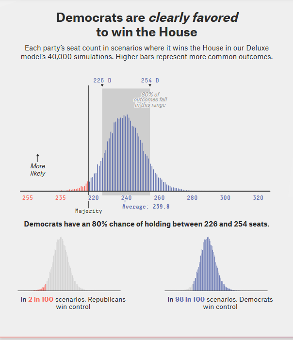And 538’s model finds a 98% chance that Democrats keep the House, and even slightly increase their margin there: