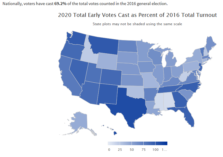 There’s a very important point to keep in mind about all the above polls as well. I mentioned this last week, but it bears repeating. These are not just leading indicators of how people may vote tomorrow. They’re also what people were saying as they were actually voting. As of this writing, early voting equals just shy of 70% of 2016 total votes: