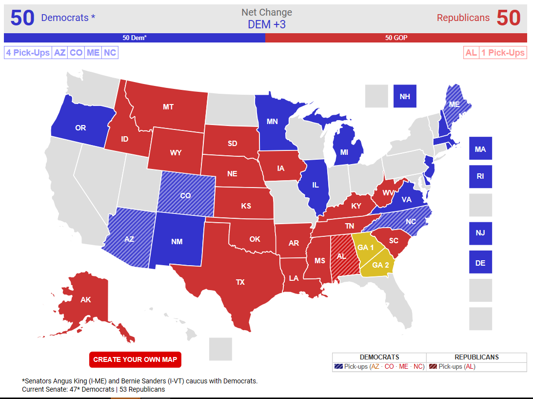 In terms of other elections, the RCP Senate no toss-ups map currently shows Democrats making a net gain of 3 seats, and tied in two others: