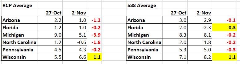 It is of course state totals and the resulting electoral college total that is the final determinant. National averages are useful in setting a ballpark for state results, but to really get a sense, we need to look at the most likely swing states.