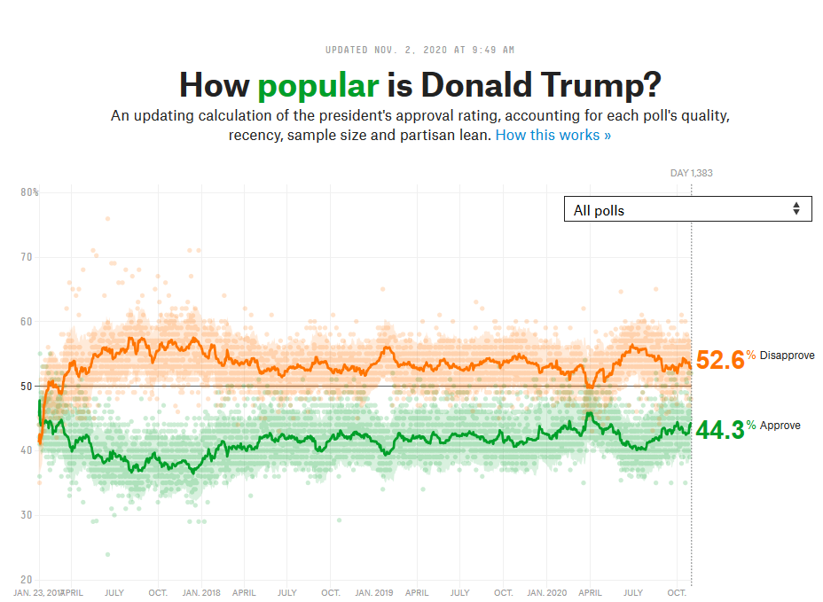 Finally, let’s check in one last time on a few other indicators. Trump’s popularity is more than 8 points underwater with one day to go until the election: