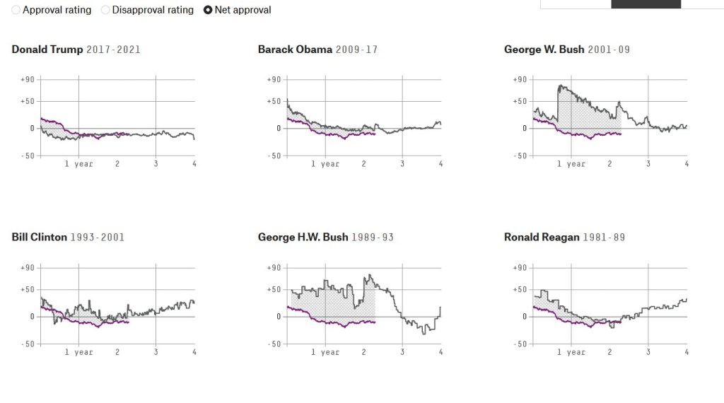 On the other hand, that number is a weak indicator this far out. We can say that his net approval isn’t that much different from same period lows of first term Reagan, Clinton, and Obama, who all went on to handily win reelection: