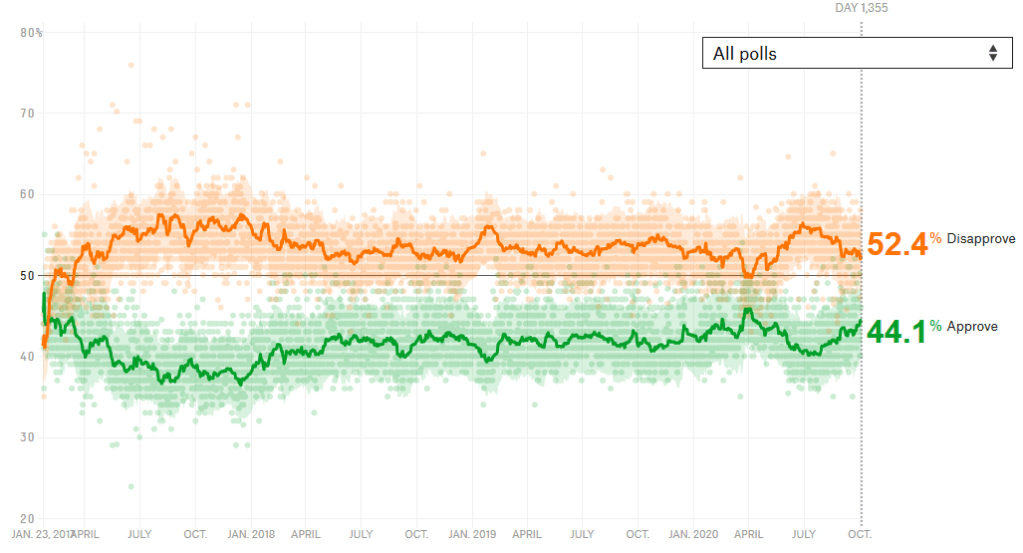 Last week, RCP had Biden ahead in 6 out of 6 swing states. It now shows him ahead in 5 out of 6, with some seeming movement towards Trump. However, RCP is also including some pollsters that have had a…questionable…habit of producing implausibly Republican-leaning numbers. 538, as mentioned, tries to adjust for things like this, and it shows Biden ahead in 6 of 6, and only Wisconsin having (pro-Biden) movement that’s outside of a tiny tick up or down that’s indistinguishable from statistical noise.
