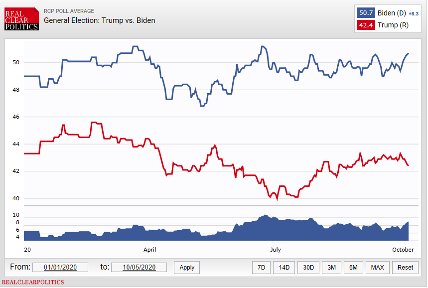 If that’s all it’s moved in 6 days, it’s not likely to suddenly change in 24 hours, and if Biden is ahead by more than 6% nationally, he probably wins, no matter what chicanery the GOP pulls at the state level. Don’t just take RCP’s word for it, though. The 538 average is much more sophisticated, as it takes into account the historical accuracy of various pollsters, and their typical partisan lean. It has Biden up by 8.4%, down slightly from 9.2% six days ago: