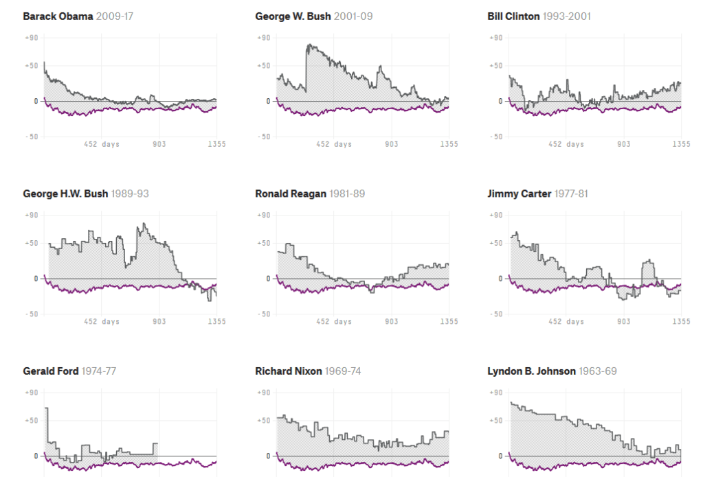You probably don’t need anyone to tell you this, but that’s not a great place for an incumbent to be. And, indeed, his net popularity is well below any President who was going on to re-election in the past 50+ years. It’s more like Carter or Bush I when they were about to be defeated, or Johnson when he was so unpopular from Vietnam that he’d decided not to run again: